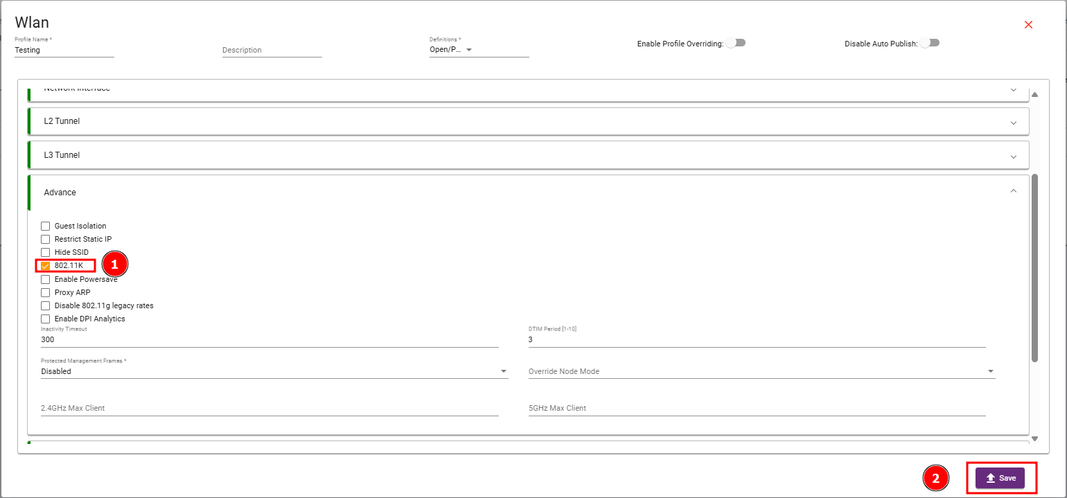 Step 2: Navigate to the Advance Section, enable the 802.11K checkbox, and then save your changes.