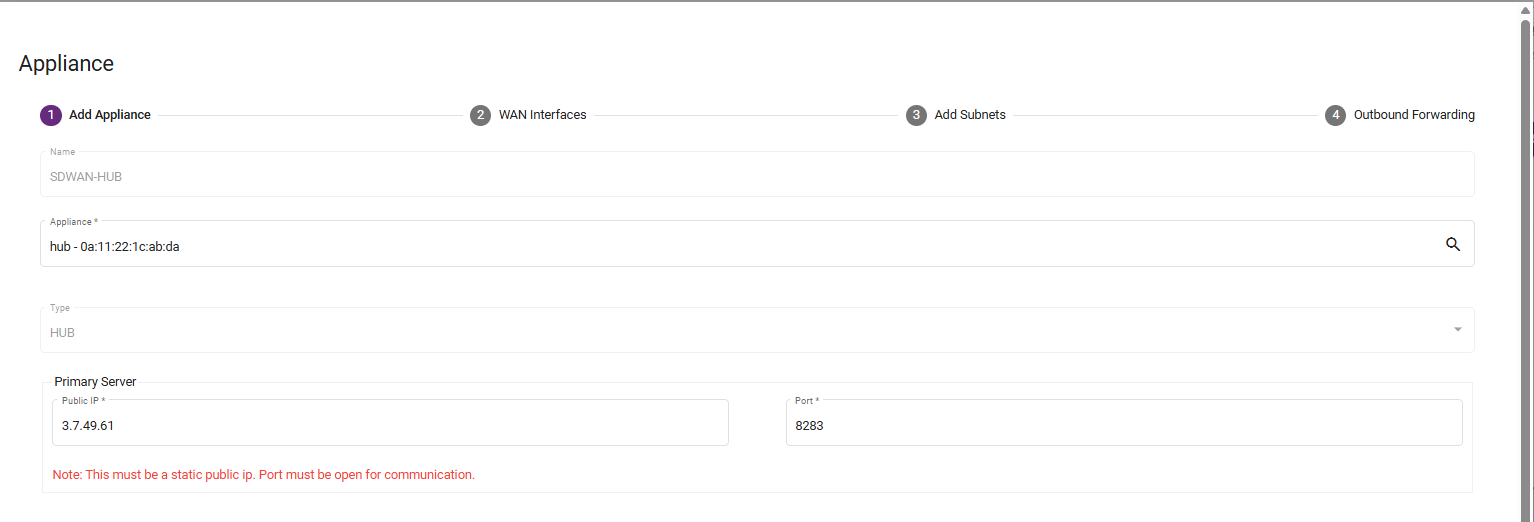 Appliance Public IP: Enter the static public IP configured on the HUB device.