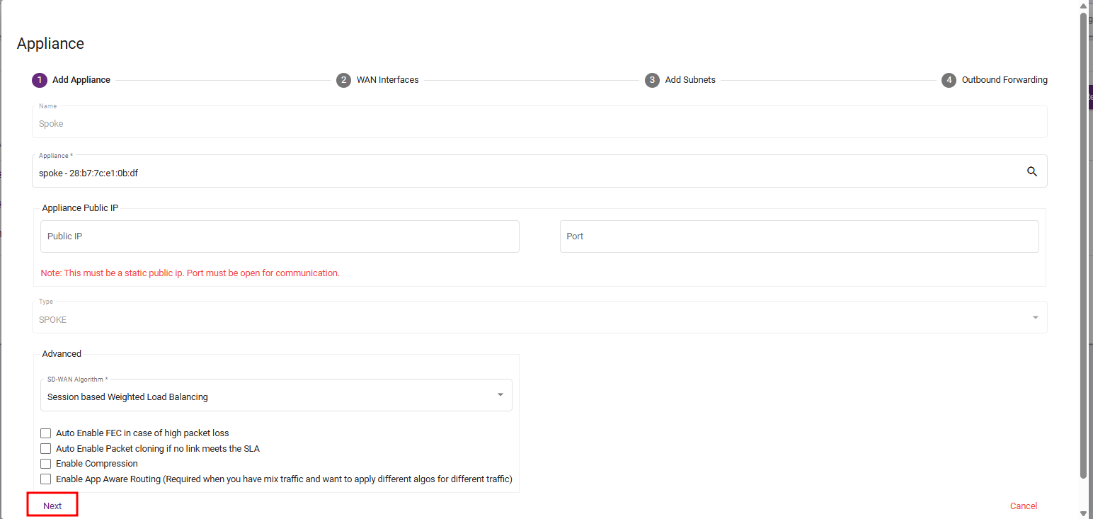 Appliance: Select the SPOKE device’s MAC address.