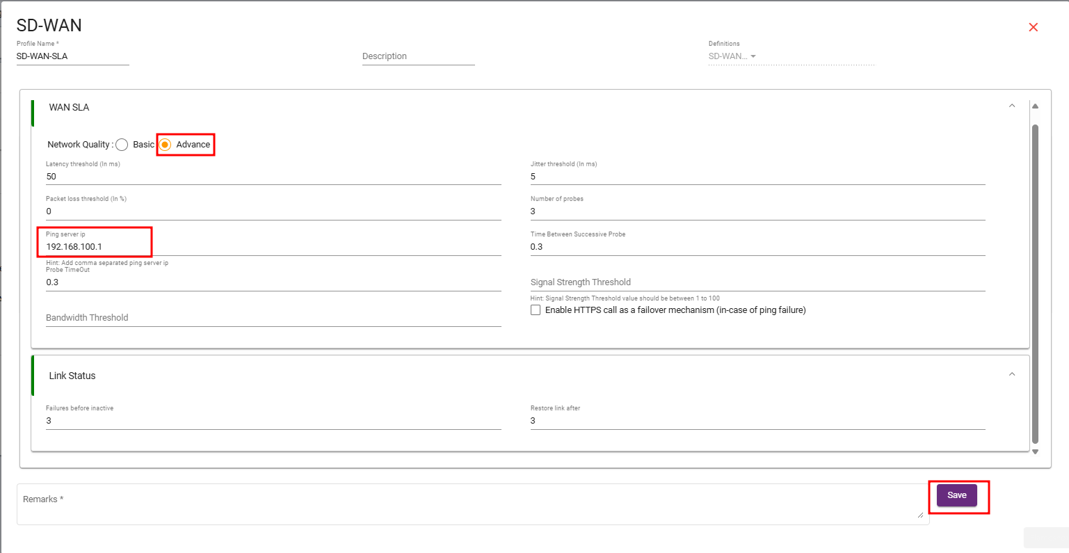 - SD-WAN SLA: Navigate to the spoke branch and create the required SD-WAN SLA and SAVE