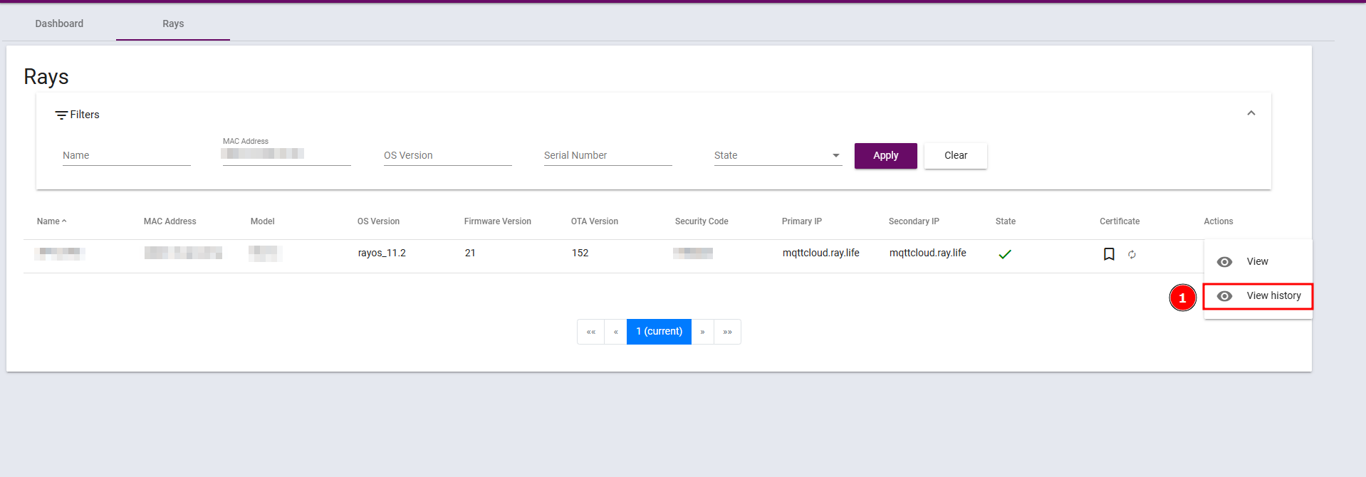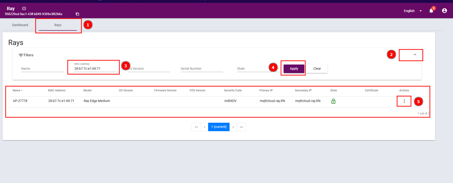 Steps 2: Navigate to the Rays section, enter the MAC address, and click Apply. The details are displayed, but the device is not connected to the Internet (Before).