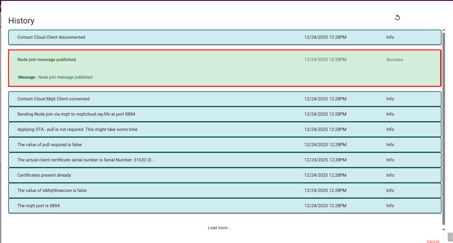 After connecting to the Internet, click the three-dot Action menu. Selecting View History shows the message “Node join message published”, indicating success.