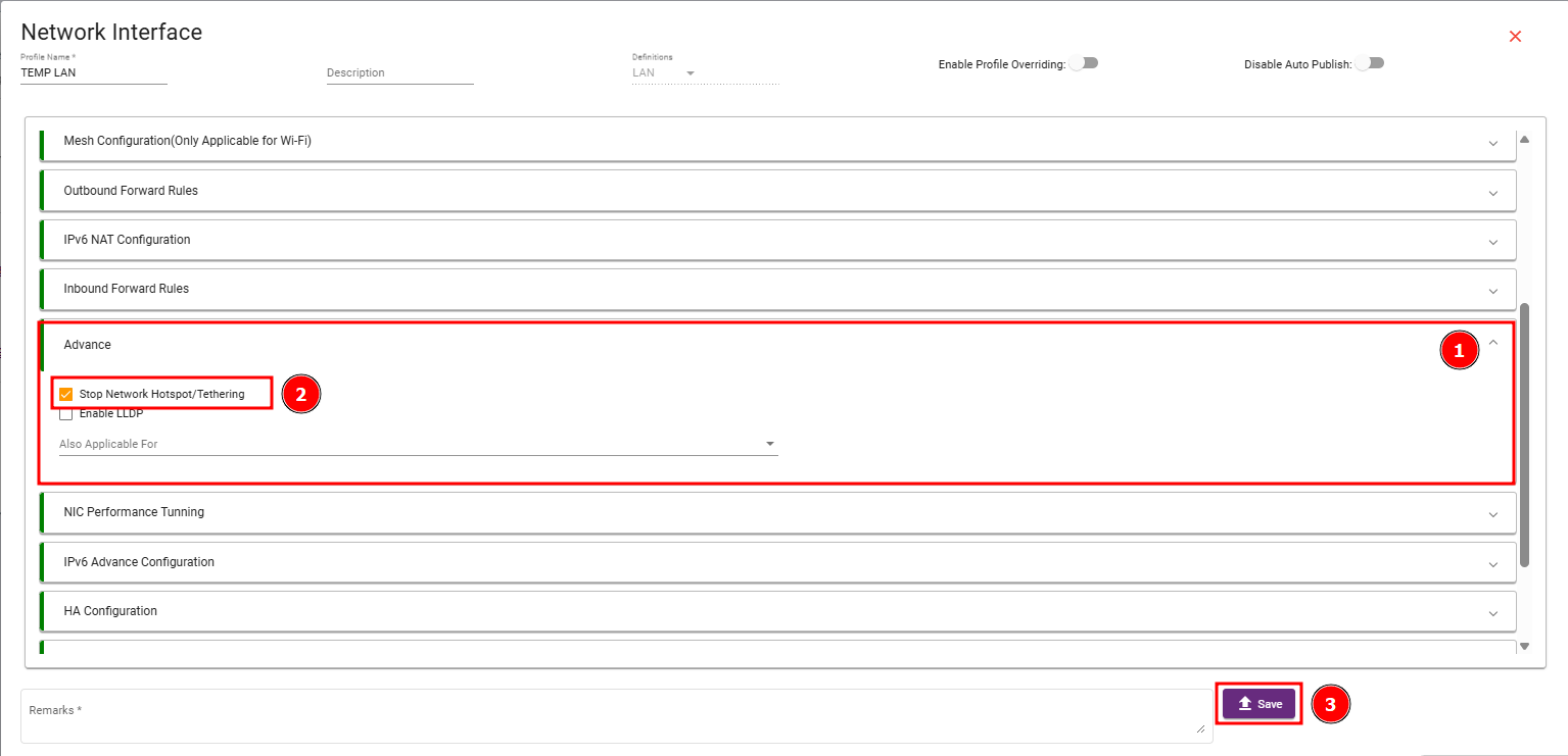 Steps 2: Go to Advanced, enable Stop Network Hotspot/Tethering, and save the changes.